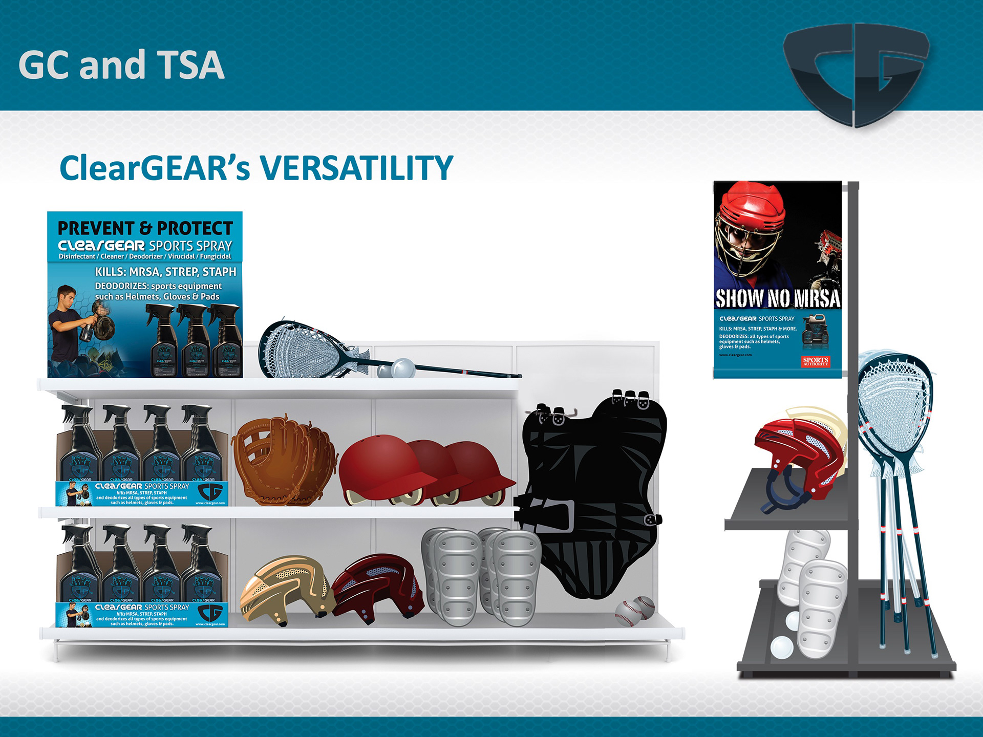 Slide presentation pitching ClearGear to potential distributors, including illustrative visuals of point of sale promotion and product placement.